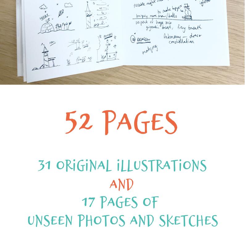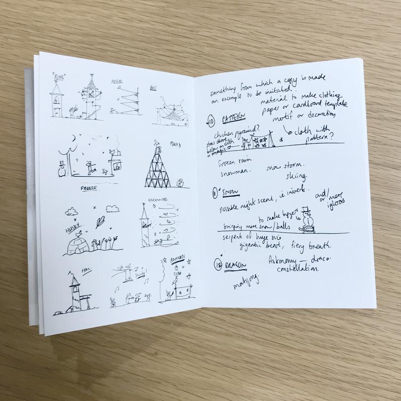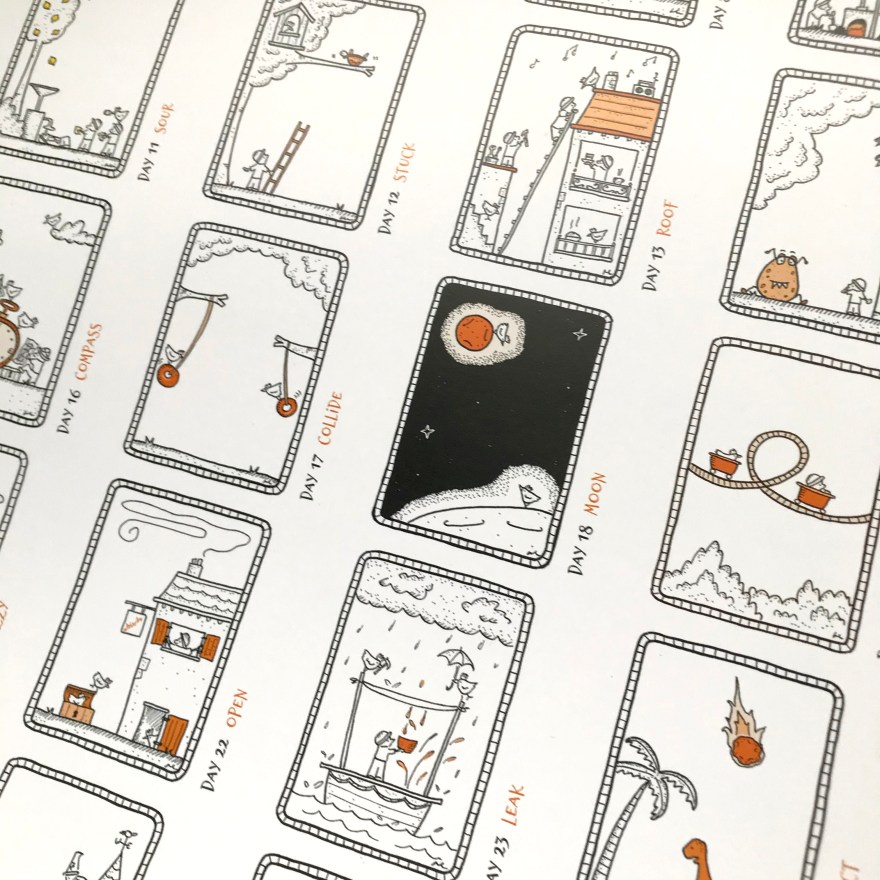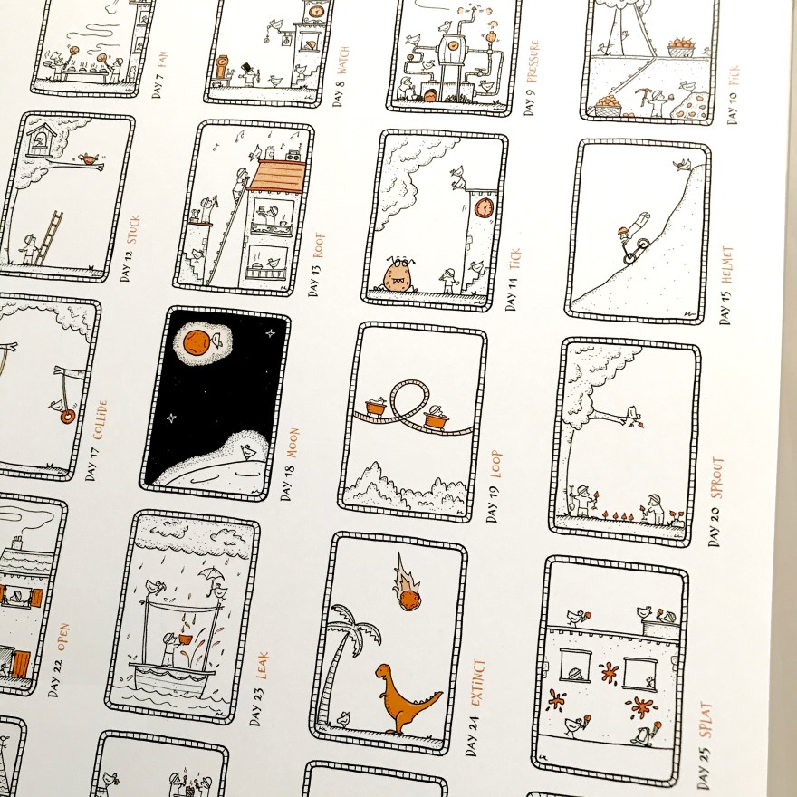This year, I committed a lot of upfront time to researching the semantics of each word, and trying to come up with really creative solutions. As I was happy with the outcome, and received a lot of messages asking about my process, I decided to publish a book of the drawings, along with pages from my sketchbook and photos of my materials and the approach I took.