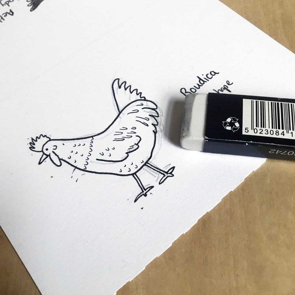My first step is to draw a rough pencil outline, and then ink over the top. This is the only project I have where I actually use pencil first rather than going straight to ink. This is because, frankly, I’m not terribly good at drawing real chickens from life – hence I started the project to get better at it!