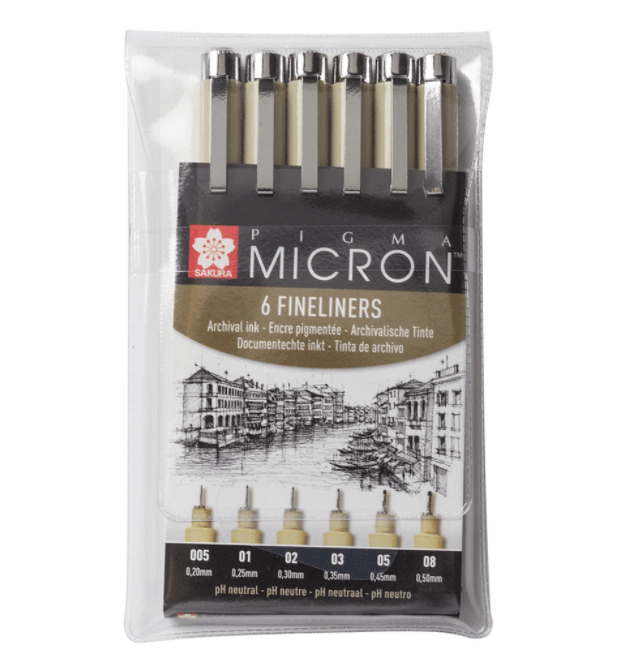 My go-to pens for many years now have been Sakura Pigma Micron Fineliners. I have a standard 6 pack in every drawing bag and case I have, but you can see the full range here.