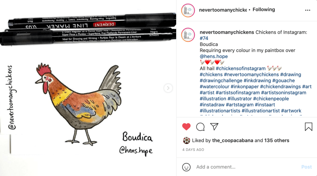 This started in Feb 2020, right before the first UK lockdown, where for some reason I decided it would be a fun challenge to draw the various Chickens on Instagram, with their own accounts or featured on their owners (..parent’s..?) account.