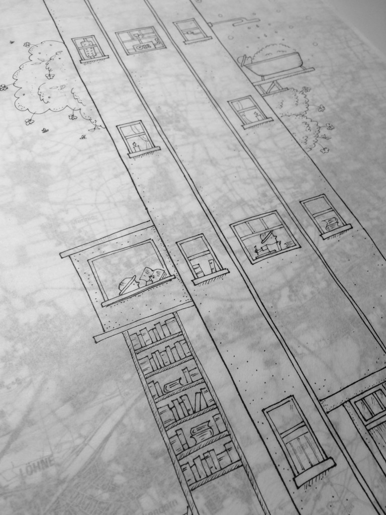 Here you can see how I experimented with different pen sizes for different features in the architecture, working out which nib size of which drawing pen brand I would need to replicate the effect I’d expect on standard drawing paper.