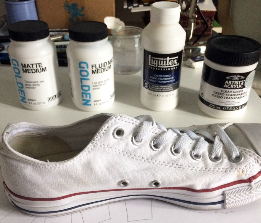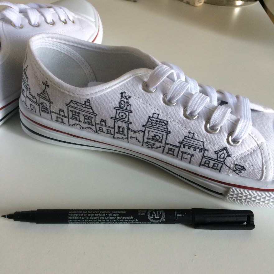 Initially, I tried both Sharpies and fine line permanent markers on old converse (grey) and cheap white canvas sneakers.