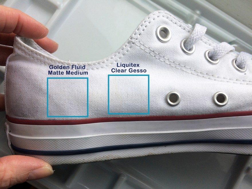 What I was looking for was a light gesso, that wouldn’t make the canvas too stiff, wouldn’t remove the texture of the material, and wouldn’t darken or dirty that brilliant white.