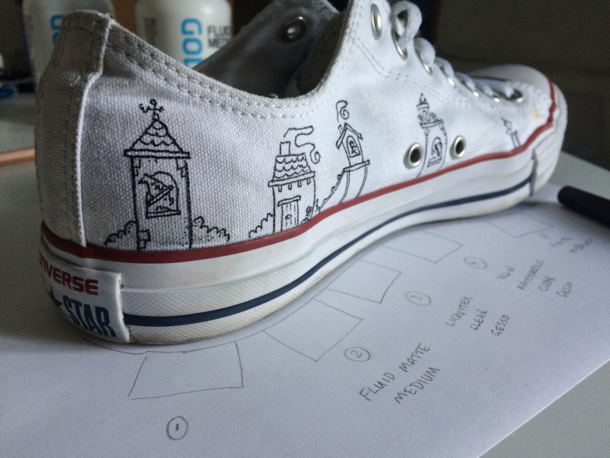 As you can see, although not dreadful, there is some bleeding into the material. The permanent markers gave me far more control than sharpies, so those were definitely the right pen – but how would I get the line to be crisper and cleaner and more like my work on paper? Especially as I wanted to move on from cheap canvas shoes to real Converse – and you don’t want to mess those up at £40+ per pair.